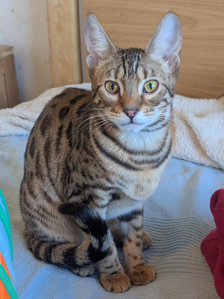 HEBE is a 7-month-old female Bengal. She came to us from a hoarding situation where she was kept with 75 other cats! Now in foster care, she is really starting to come out of her shell. Bengal cats are real characters, usually keen hunters, and love the outdoor life. If you are interested in Hebe, then get in touch!!